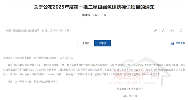 海西房产网(微信号:fjhxfcw)动静:4月10日,按照《绿色建建标识办理法子》(建标规〔2021〕1号)和《福建省绿色建建标识办理实施细则》(闽建〔2022〕7号)相关,经项目单元申报、项目所正在设区市住房和城乡扶植部分保举、现予发布。福建省住房和城乡扶植厅下发“关于发布2025年度第一批二星级绿色建建标识项目标通知(闽建科〔2025〕9号)”。福建省住房和城乡扶植厅下发“关于发布2025年度第一批二星级绿色建建标识项目标通知(闽建科〔2025〕9号)”。按照《绿色建建标识办理法子》(建标规〔2021〕1号)和《福建省绿色建建标识办理实施细则》(闽建〔2022〕7号)相关,省住建厅组织开展了2025年度第一批二星级绿色建建标识项目认定工做。确定厦门中海2022P15地块项目(学仕里)、厦门2022JP04地块(国贸锦里原)(1#-3#、5#楼)、福州建工(集团)总公司“建建出产”3个项目为二星级绿色建建标识项目,